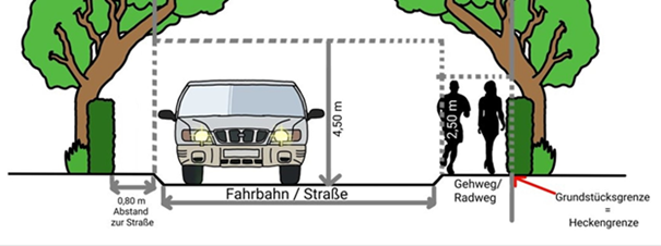 Es wird gebeten die Gehsteige abzukehren und auf der Straße geparkte Autos wegzufahren um die Straßenreinigung zu erleichtern. Damit alle Straßen auch von großen Kehrmaschinen angefahren werden können, ist besonders darauf zu achten, dass Hecken, Sträucher und Bäume bis zu einer Höhe von 4,50 m und zur Grundstücksgrenze hin zurückgeschnitten wurden. (siehe beigefügte Skizze)